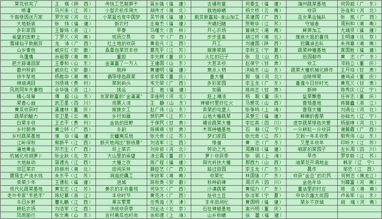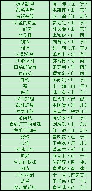 大赛作品分为纪实类和创意类。第四届大赛参赛作品的思想性、艺术性进一步提高,技术水平大幅度提升,涌现出一大批好作品。本届大赛作品的突出特点有:一是照片后面有故事,特别是一些组照选题独到,跟踪采风,讲述了生动的菜农故事;许多摄影师还深入到西北、西南贫困地区,拍摄了大量反映农民脱贫致富谋发展的生动影像。二是人物和场景刻画深刻,真实感人,表达了摄影师深入最基层对农业农民的理解和情感。三是作品视角广泛,不仅覆盖了蔬菜生产、科技推广、市场加工、农村新貌等方方面面,而且还展现了多地少数民族菜农的风情。四是艺术手法多样,构图视角、人物表现、光影应用等都有精准和独到之处,有的还利用了航拍等新的工具,使作品的表现力和视觉冲击力大大增强。